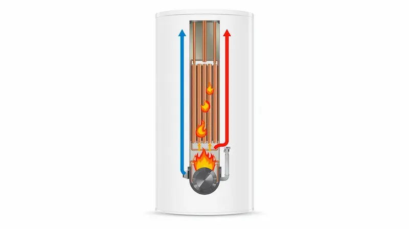 How it works: It fills a 40, 50, or 80-gallon drum with cold water. A gas burner (at the bottom) or electric elements (inside) heat that water to a set temperature (usually 120°F).